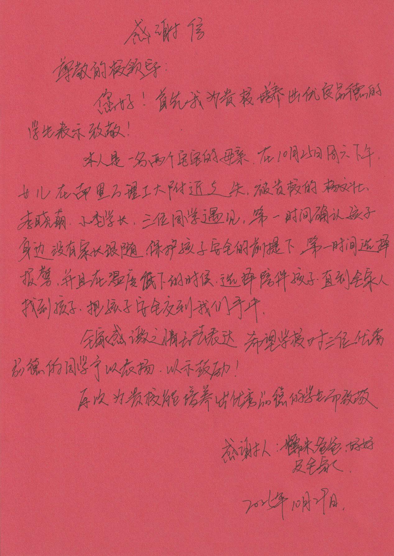 29日上午,孩子家长带着感谢信和锦旗来到学校专程向这三名同学再次表达感谢。