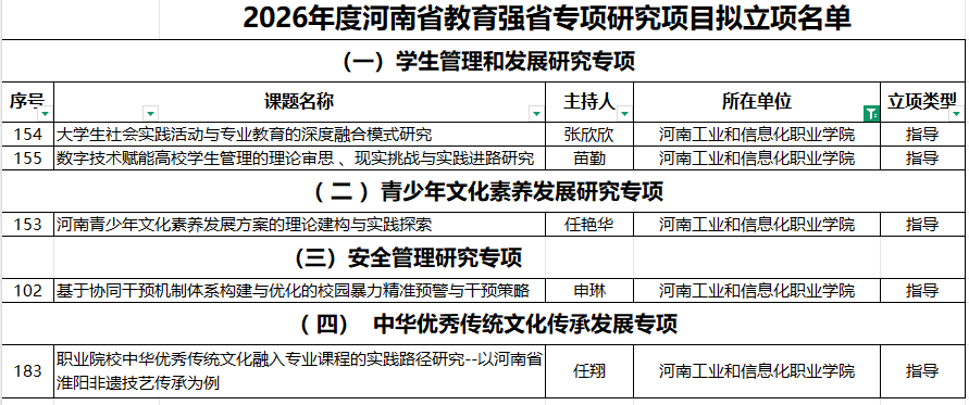 近日,河南省委教育工委办公室、河南省教育厅办公室公布了2026年度河南省教育强省专项研究项目拟立项名单,我校5位教师的科研项目获准立项。具体名单如下。