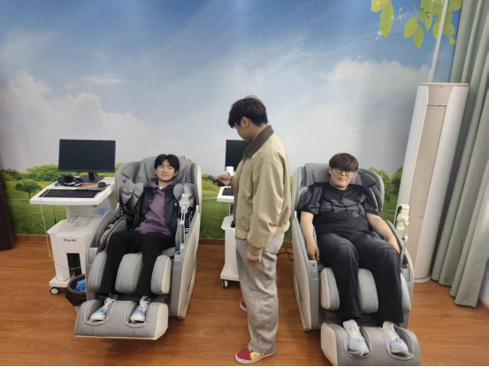 在音乐放松室,同学们亲身体验音乐减压放松椅、唱吧机及体感音波床等专业设备,在旋律中缓解焦虑、放松身心。