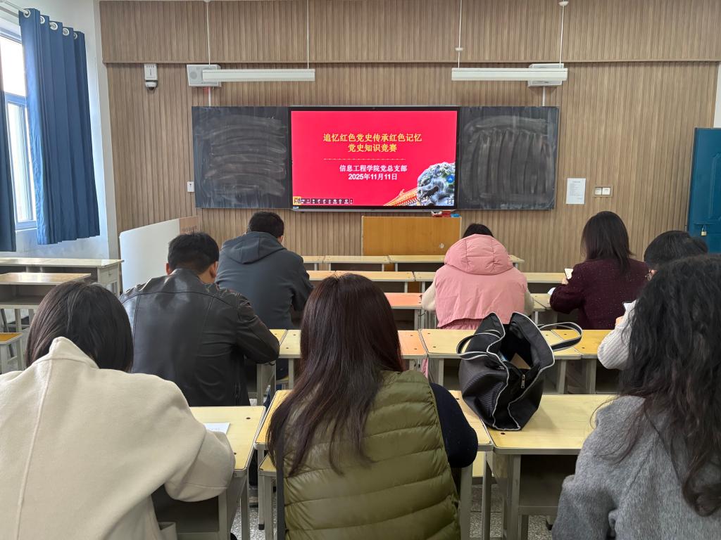 为深入学习贯彻党的二十大精神,推动党史学习教育走深走实,引导党员教师与青年学子从党的百年奋斗征程中感悟思想伟力、汲取奋进动能,2025年11月11日,信息工程学院党总支面向全院党员教师及学生干部,成功举办“追忆红色党史 传承红色精神”主题党史知识竞赛。