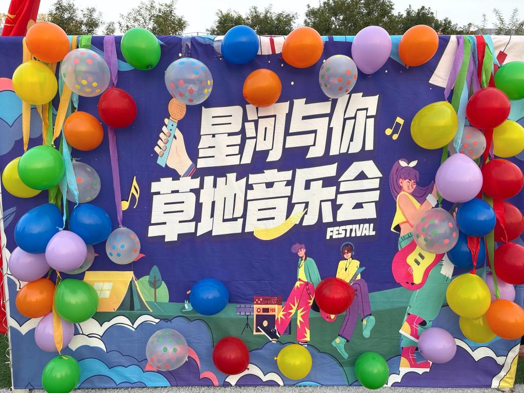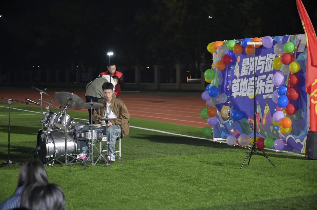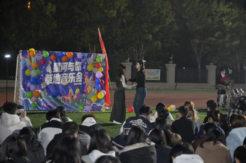 晚七时许,夜幕渐浓,校园足球场化作浪漫的露天剧场——草坪上点缀着点点荧光,师生们或围坐成圈,或轻声交谈,期待着演出开场。随着灯光缓缓亮起,一段活力四射的开场秀瞬间打破夜色的宁静,“星河与你”草坪音乐会正式拉开帷幕。没有舞台的隔阂,没有座位的界限,师生们以青草为席、以星空为幕,在开阔的户外空间里,沉浸式感受音乐带来的治愈与力量。